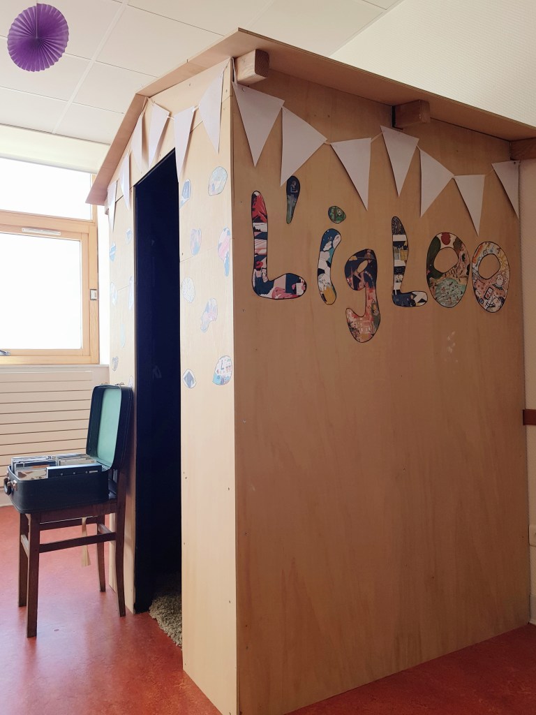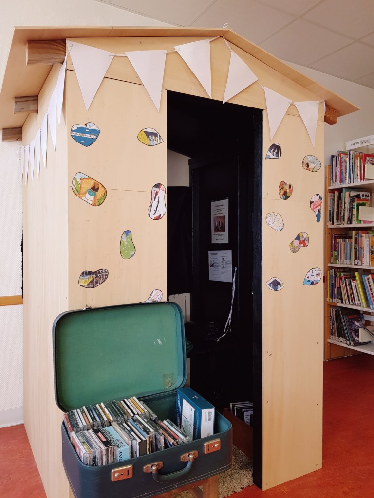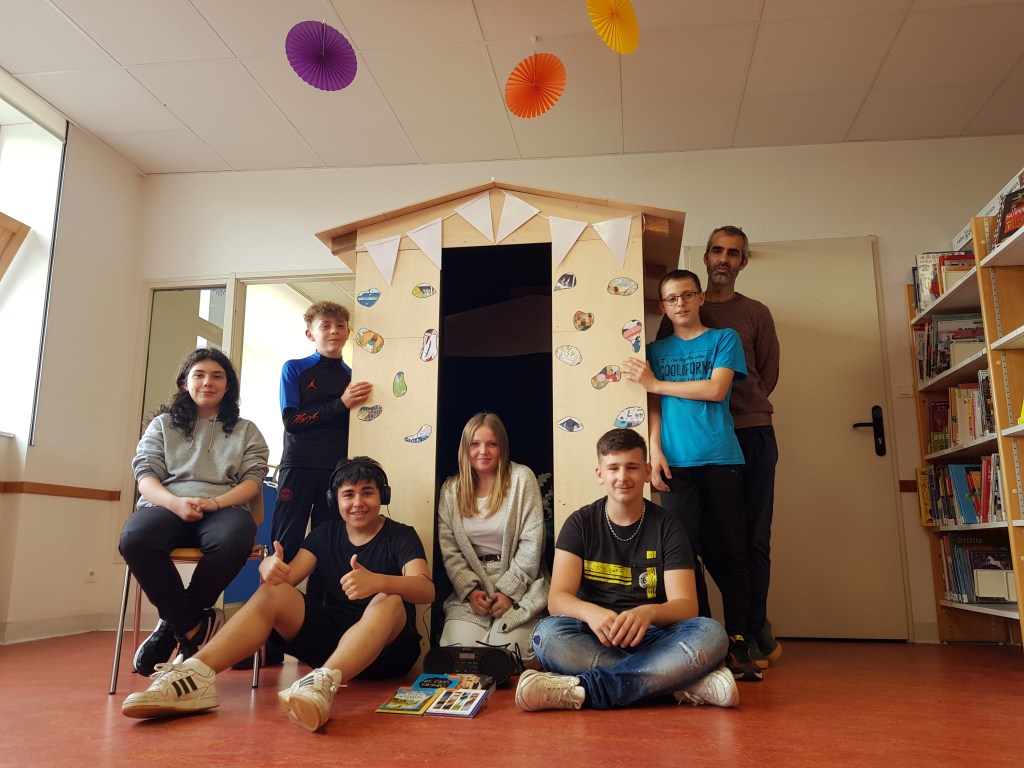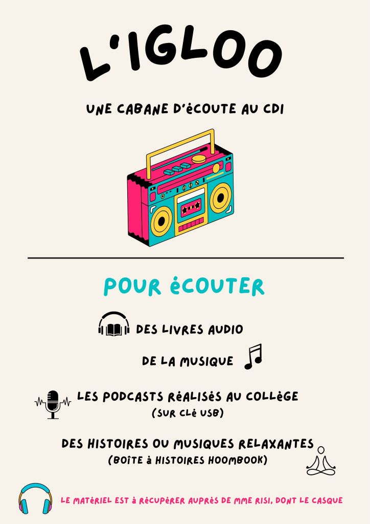 Il s’agit d’une cabine d’écoute dans laquelle, à tout moment de la journée, un.e élève peut s’installer – casque sur les oreilles – pour découvrir de la musique, des histoires audio ou l’univers relaxant du livre audio hoombook (musiques, ambiances sonores apaisantes, sons de la nature…). Les podcasts réalisés au sein du collège sont également disponibles à l’écoute sur clé USB.