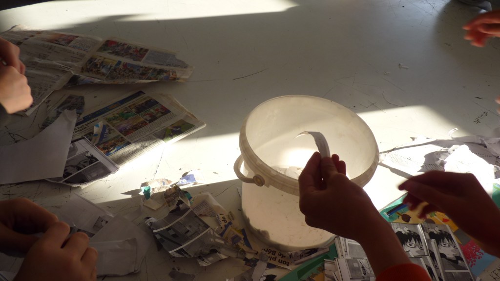 Lors de cet échange, Mme Naletto a pu observer les élèves à l’écoute et curieux d’apprendre de nouvelles choses sur un objet qui nous semble si familier. Ils ont ensuite pu se confronter à la matière, en la déchirant, en la faisant bouillir, en la broyant. Enfin, ils ont eu le plaisir de contempler le fruit de leur travail: des feuilles de papier recyclé avec des formes, des textures, des couleurs uniques .