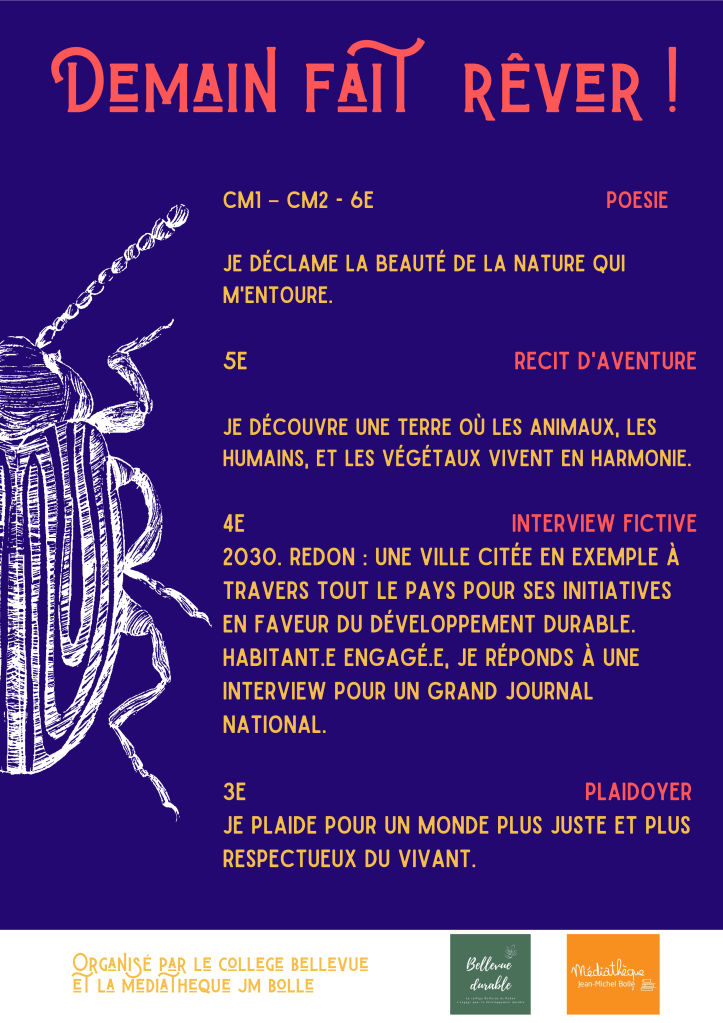 Le concours est à destination des écoliers de Redon et des environs (écoles publiques), des collégiens des établissements publics de Redon (Beaumont, Erea, IEM, ITEP), des publics de la médiathèque de Redon.
