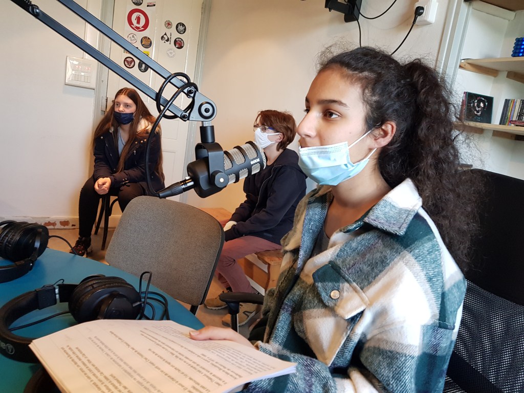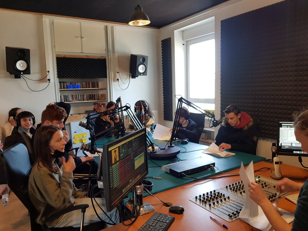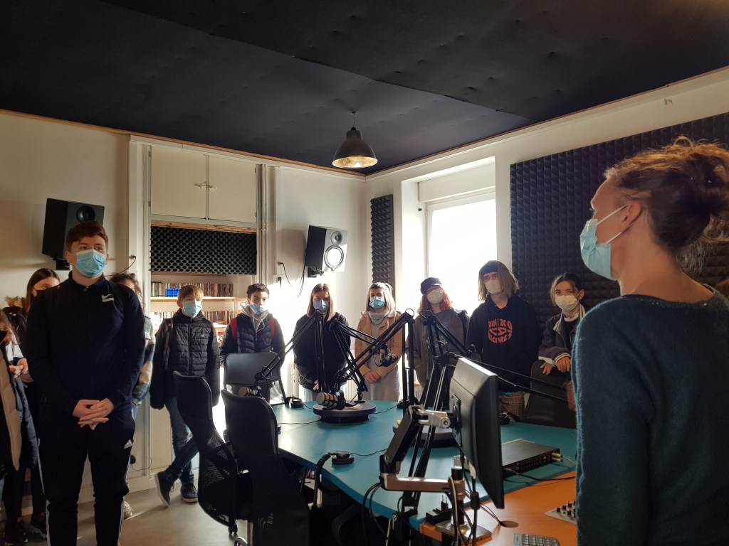 De ce travail est né un podcast, réalisé en partenariat avec la radio Timbre FM située à Augan (56). Après un peu plus de vingt heures passées au collège en compagnie de l’animatrice de la radio, Fanny Gimeno, c’était au tour de la classe de se déplacer dans les studios de la radio.