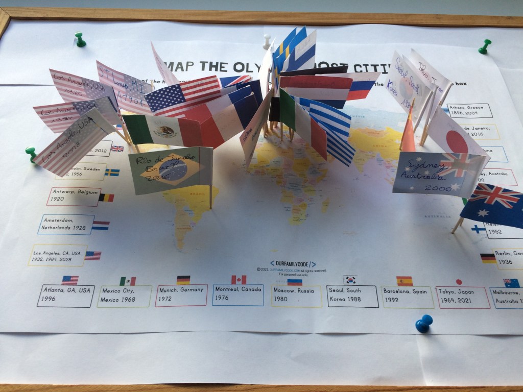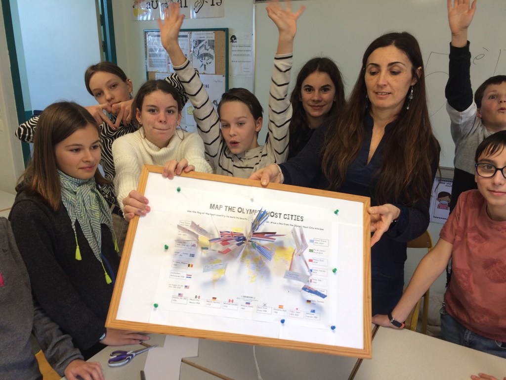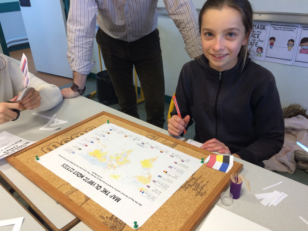 Ce mardi 22 novembre, quelques élèves de la classe olympique ont réalisé une « carte des JO » de 1900 à 2024. Ils ont repéré les pays et les capitales ayant accueilli les Jeux Olympiques sur un planisphère et les ont marqués d’un drapeau : un savant mélange de géographie, d’anglais (noms des pays et villes en anglais, s’il vous plaît !) et de géo-politique afin que les élèves prennent conscience de l’inégalité dans la répartition de ces événements au niveau mondial : beaucoup de drapeaux en Europe et en Amérique du Nord mais pas un seul sur le continent africain … ceci donne à réfléchir alors que s’ouvre aujourd’hui même la Coupe du Monde de Football … au Qatar …