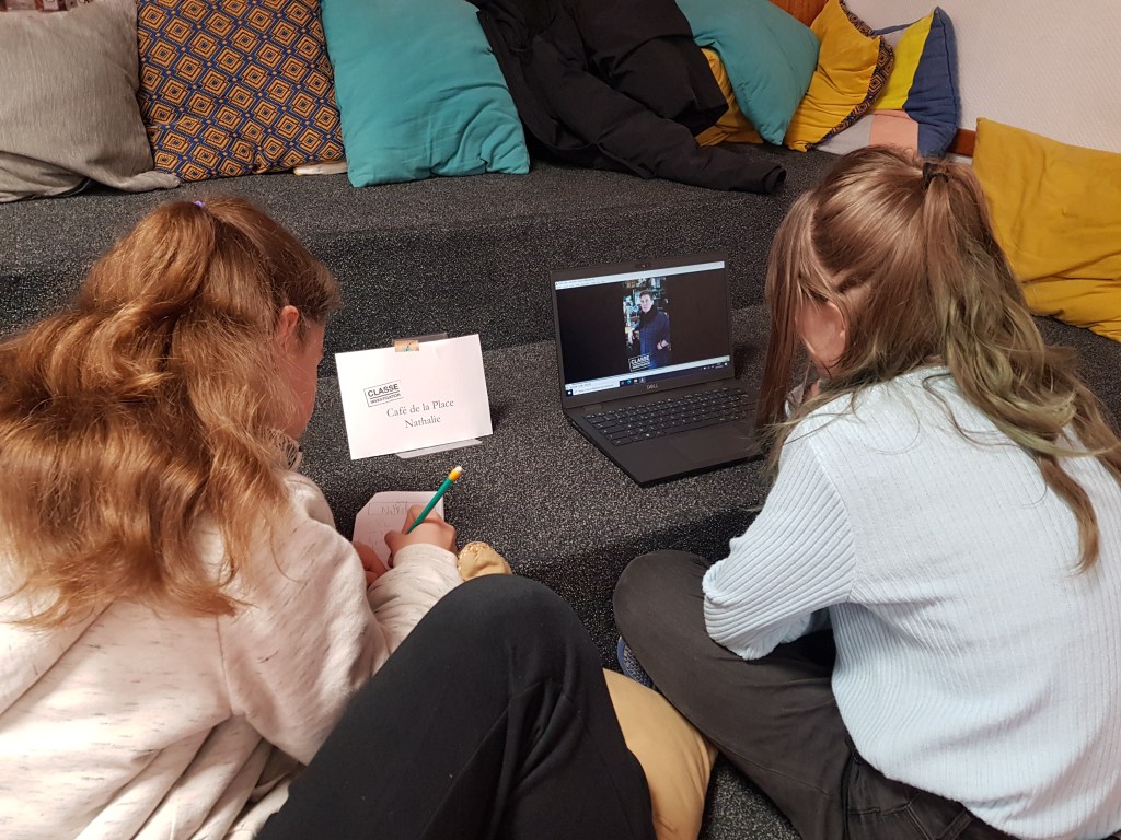 Plongés dans une enquête journalistique immersive, les élèves répartis en six groupes devaient consulter différentes sources (témoignages vidéos à disposition sur les ordinateurs, documents papier). A eux ensuite de trier et hiérarchiser les informations récoltées pour produire à un reportage vidéo (type duplex) pour un journal d’information télé fictif. Les six reportages, filmés au terme de deux heures d’enquête journalistique, ont été visionnés en classe pour un debriefing digne d’une vraie rédaction !