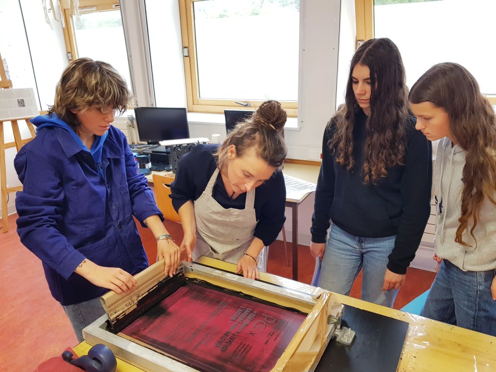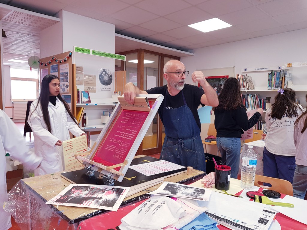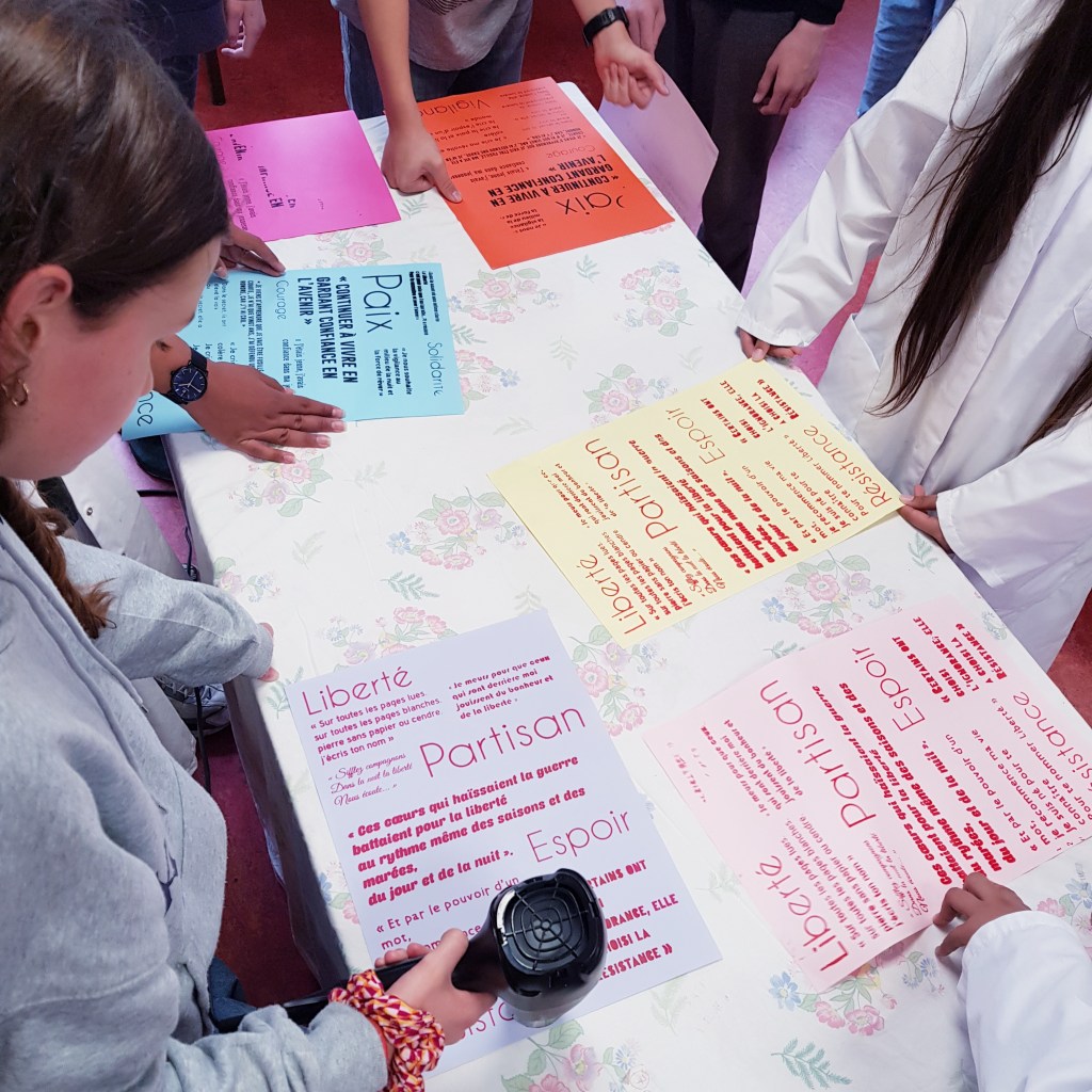 Les élèves de 3eC ont pu s’initier à cette technique d’impression ancienne, mais très tendance, sur des papiers et des tissus. L’animation participe d’un projet en cours de réalisation, qui prévoit l’aménagement d’un espace mémoriel dans le hall du collège. Il sera dédié à la Résistance et à la figure d’Anne-Marie Boudaliez. En prévision de l’atelier sérigraphie, les élèves avaient établi une liste de mots et de phrases évoquant la Résistance, la liberté, la paix.