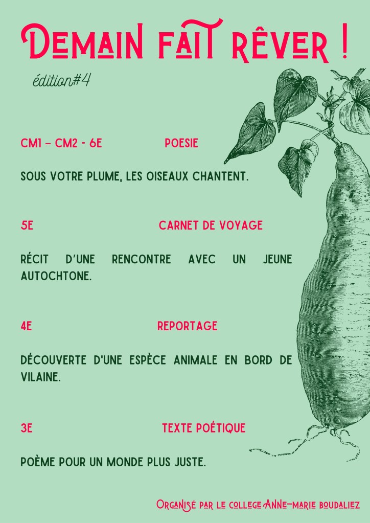 Ça bouge à Bellevue, Les projets DFR, le retour ! Publié par collegebellevue35 le 5 mars 20265 mars 2026 Après une année de pause, Demain fait rêver est de retour ! Avec deux nouveautés : un concours de dessin & un prix du livre (voir article dédié). Découvrez ici les sujets de cette 4ème édition : J’aime chargement… Similaire