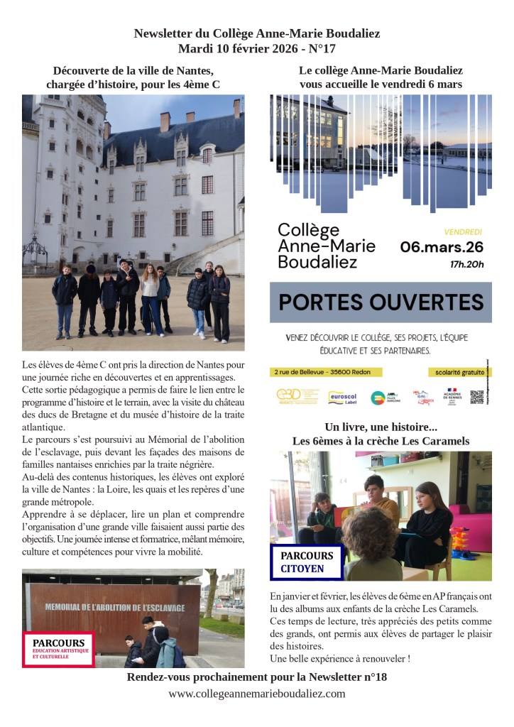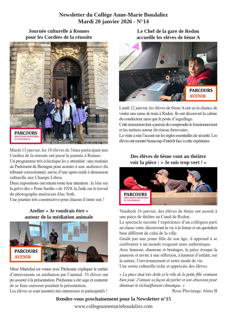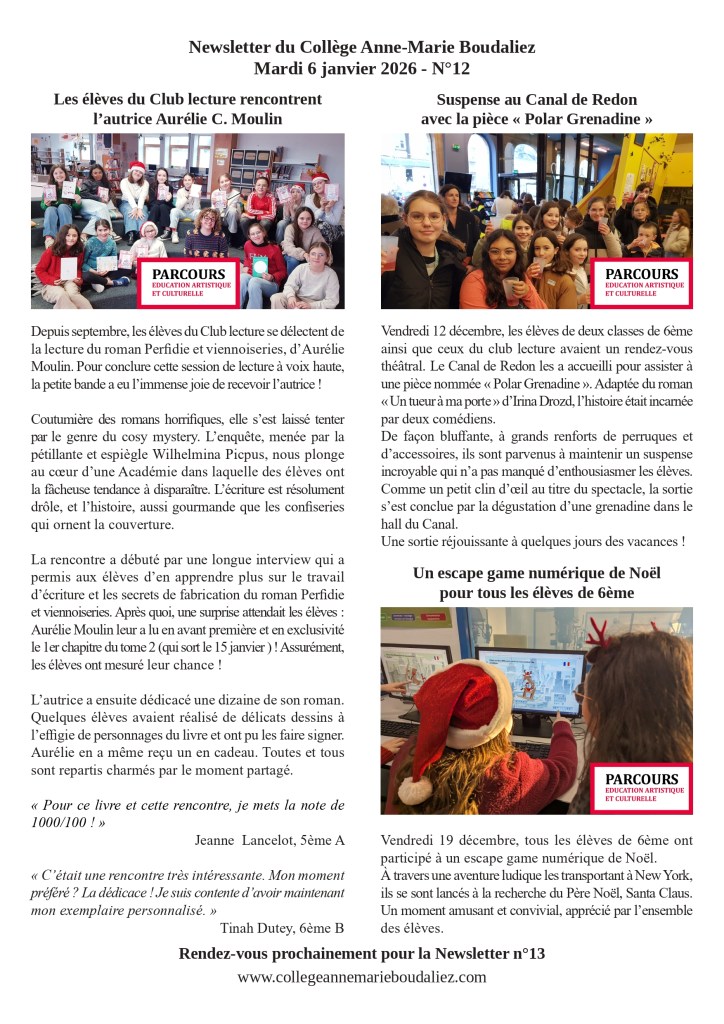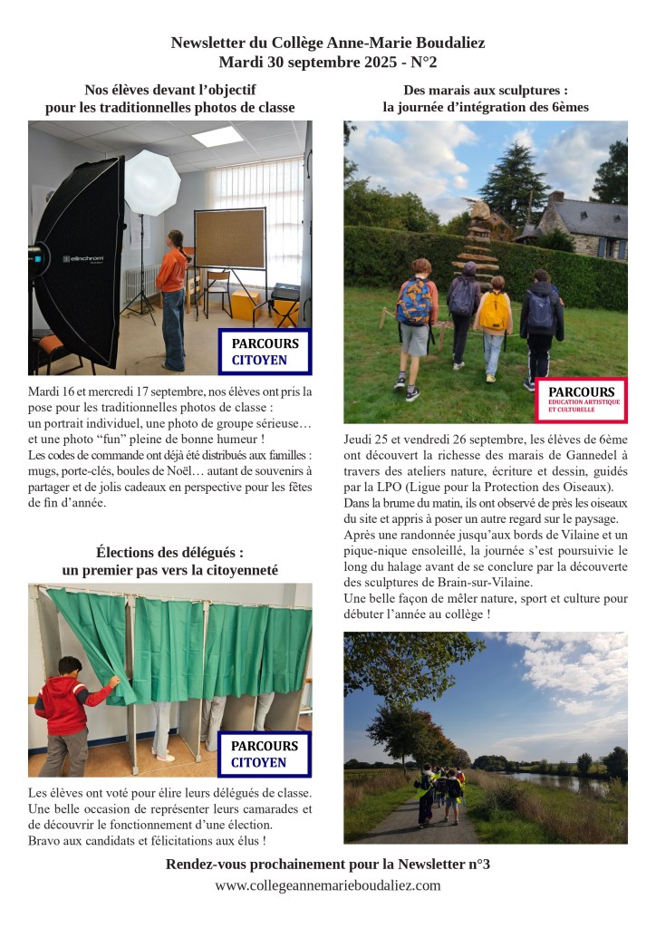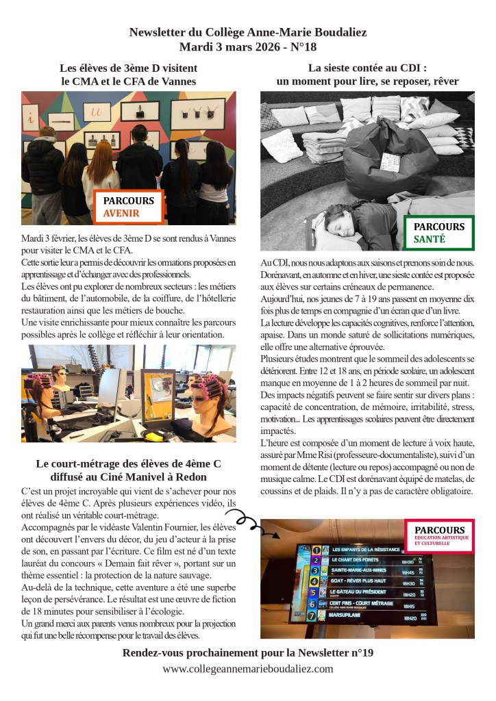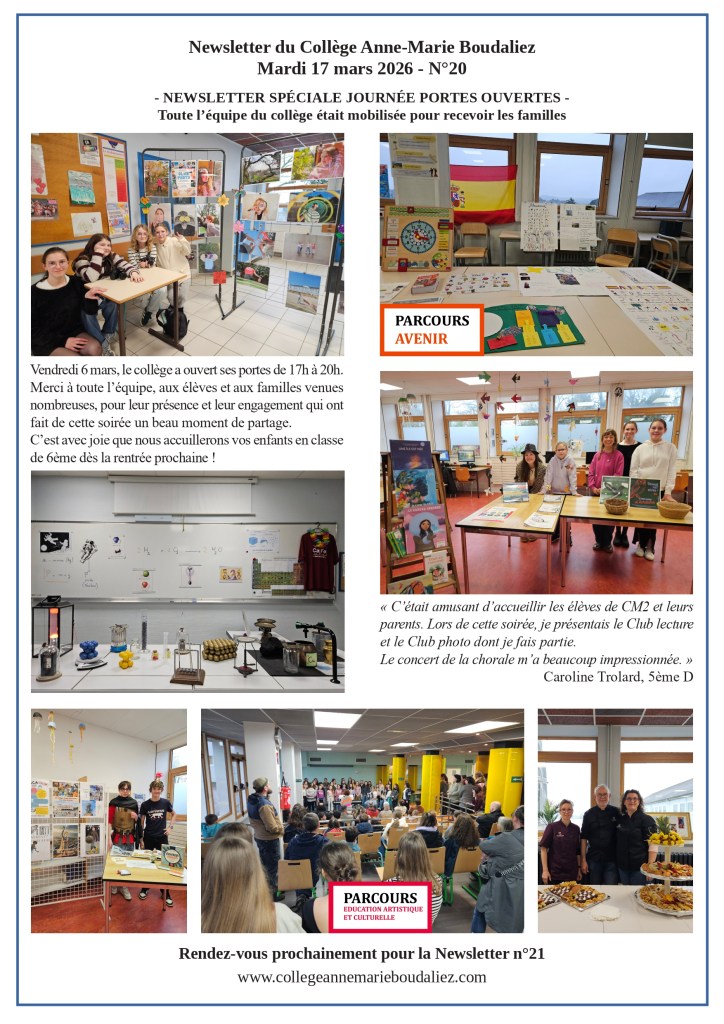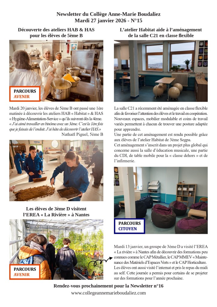 Parce qu’il ne se passe pas une semaine sans que les élèves du collège Anne-Marie Boudaliez n’explore de nouveaux horizons, Tamara Poignant va à la rencontre des équipes pour collecter les informations qu’elle nous fait partager dans la newsletter de l’établissement. Le meilleur moyen pour découvrir la richesse des parcours proposés et conserver une trace des évènements qui jalonnent une année scolaire.