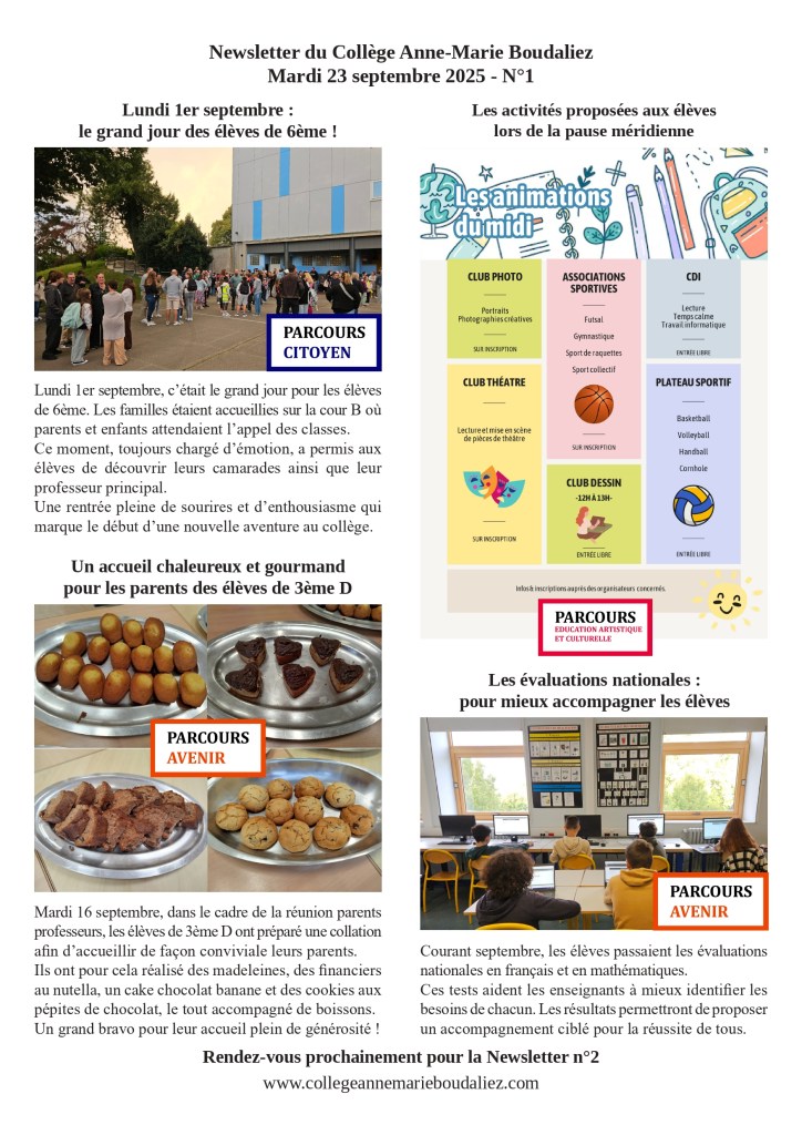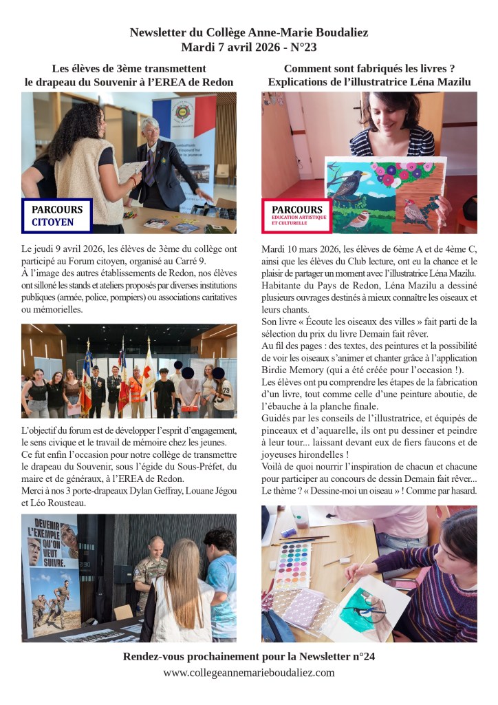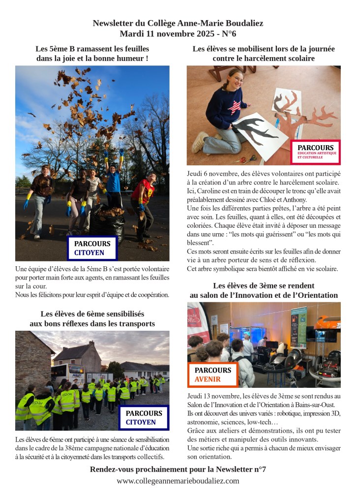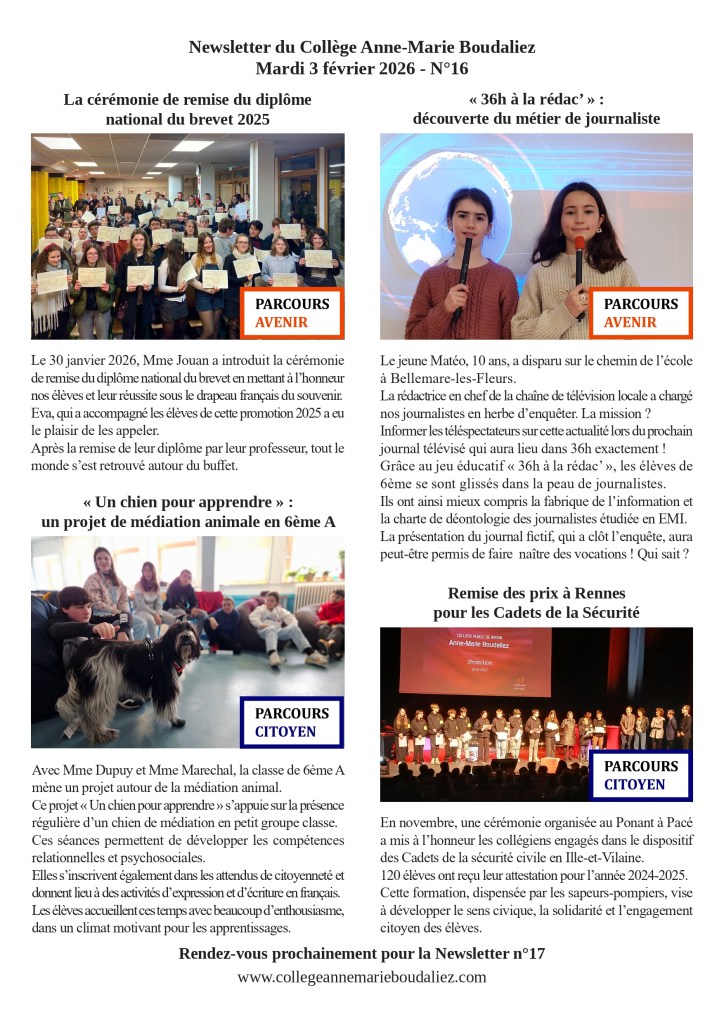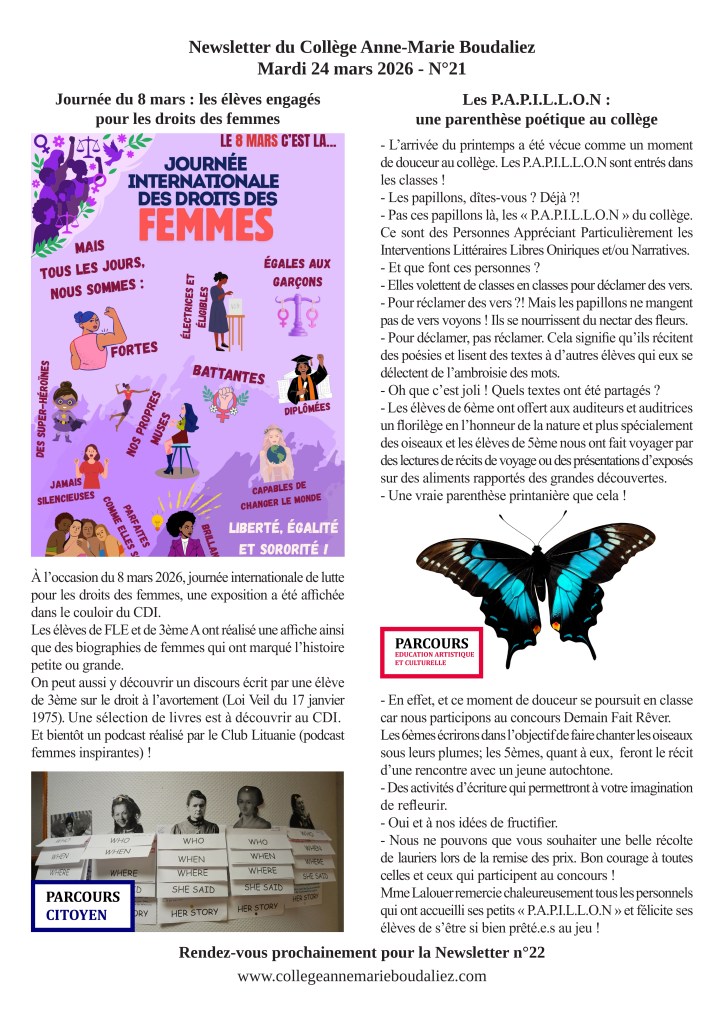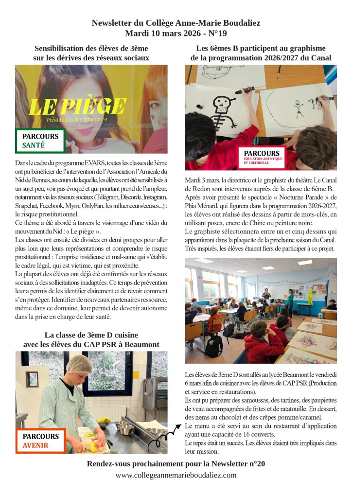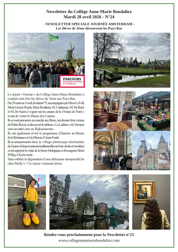 Parce qu’il ne se passe pas une semaine sans que les élèves du collège Anne-Marie Boudaliez n’explore de nouveaux horizons, Tamara Poignant va à la rencontre des équipes pour collecter les informations qu’elle nous fait partager dans la newsletter de l’établissement. Le meilleur moyen pour découvrir la richesse des parcours proposés et conserver une trace des évènements qui jalonnent une année scolaire.